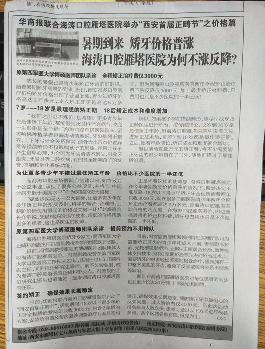 华商报联合海涛口腔雁塔医院举办“西安首届正畸节”系列报道之价格篇