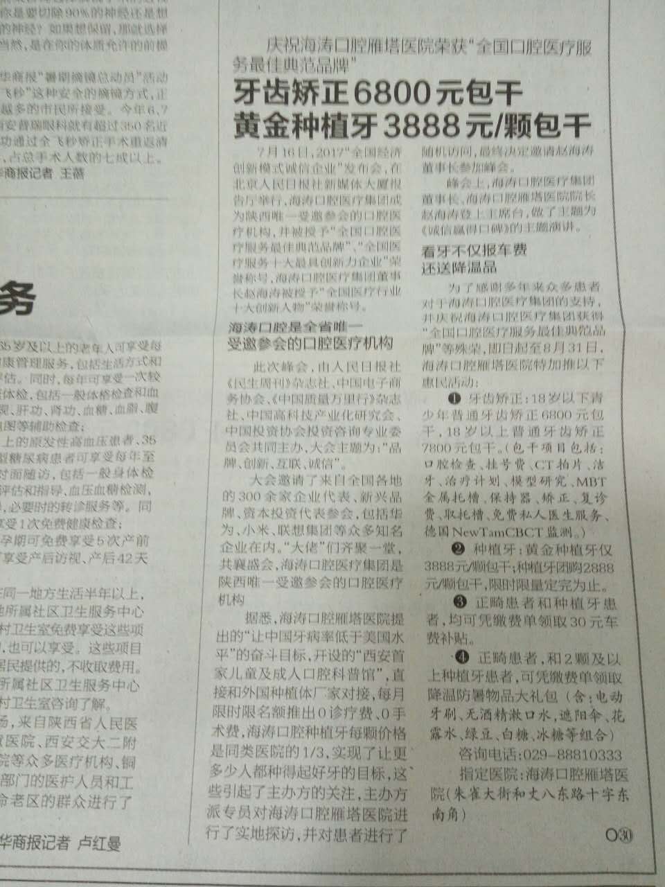 为了感谢多年来众多患者对于海涛口腔医疗集团的支持,并庆祝海涛口腔医疗集团获得“全国口腔医疗服务最佳典范品牌”等殊荣,即日起至8月31日,海涛口腔雁塔医院特加推以下惠民活动: