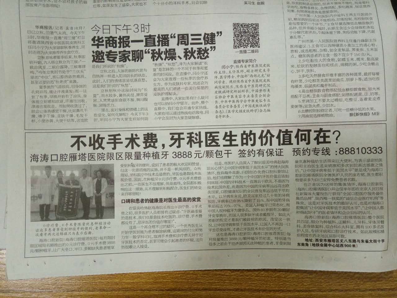 这也是海涛口腔新院(海涛口腔雁塔医院)每月限量推出 3888元/颗种植牙的初衷。特别是当很多之前由于经济原因无法种植的患者,享受到限量优惠种植给生活带来巨大便利,为表示感谢给医院和主治医生送来锦旗和多次到院表达感激之情后,“让中国牙病率低于美国水平”更是成为海涛口腔新院雁塔医院全体医护人员的座右铭,医生都积极要求多为自己安排免费患者名额。