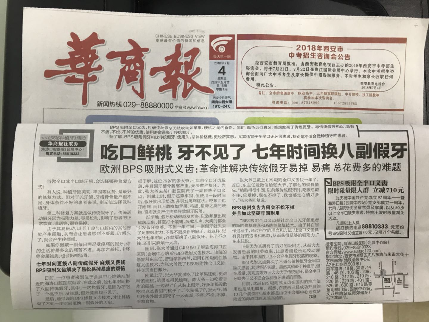 目前,瑞士BPS吸附式义齿在国内的推广使用也是凤毛麟角。据悉,在陕西已经成功开展的10几个病例中,基本都是由位于会展中心地铁站附近的海涛口腔医院实施的。