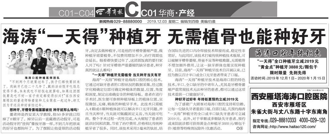 海涛“一天得”种植牙技术是海涛口腔的特色技术,半口、全口缺牙的中老年人,尤其是牙槽骨萎缩严重常规技术无法种牙的患者,都可以通过这项技术重获一口健康好牙。