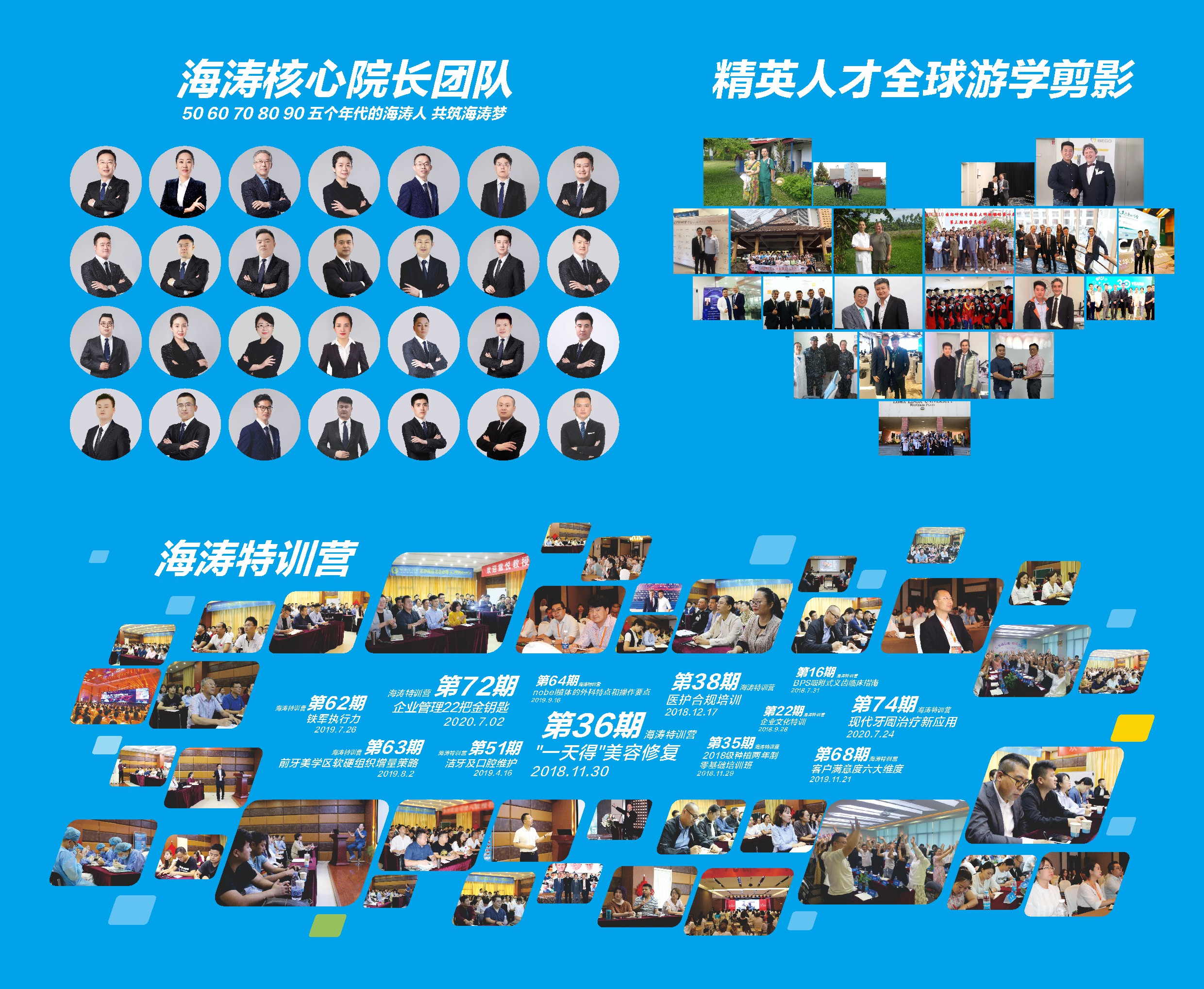 经过多年的发展,海涛口腔的管理团队不断输入新鲜血液,中高层骨干增加到了50人,整个集团干部团队达200人左右,50、60、70、80、90五个年代的海涛人逐梦前行、为梦高歌。在管理岗位上,他们是海涛集团各大区、分院的高层管理者;在手术台前,他们是凭借精湛医术为患者化解病痛的医生。变化的是身份角色,不变的是他们共同的“海涛梦”。