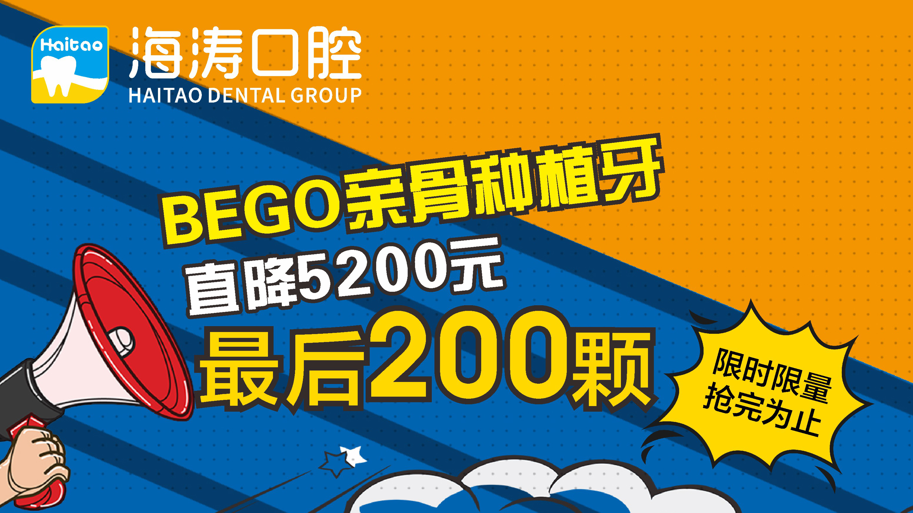 为了让更多的中老年缺牙者能够享受到种植牙带来的福利,海涛口腔九月份开展“金秋爱牙月·海涛公益行”活动,针对多颗缺失、半口或全口缺失推出了海涛“一天得”全口种植牙优惠活动,持教师证、结婚证(满20年)可在原有优惠活动基础上再减10000元;此外,海涛口腔推出了进口BEGO亲骨超导种植牙,原价15000元/颗,九月特享9800元/颗,它良好的生物相容性使得植体与牙槽骨能快速结合,加上数字化导航技术的运用,精准安全,疗程也大大缩短,受到众多缺牙患者的追捧。应广大患者的要求,海涛口腔在植体数量紧张的情况下推出最后200颗,限时限量,抢完为止。