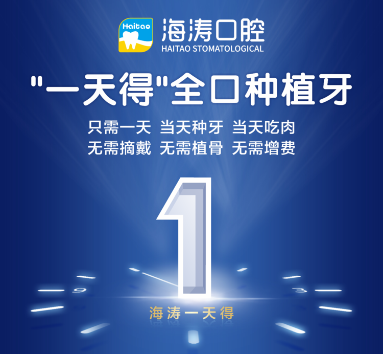 为了解决这一问题,海涛口腔在引进国际种植技术的同时,经过技术创新研发了海涛“一天得”全口种植牙技术,将传统种植3-8个月的疗程缩短为1天,大大缩短了疗程,减轻了缺牙患者的时间成本和经济成本。此外,该技术无需植骨,让骨量不足的缺牙人群在不额外增费的情况下也能享受到种植牙带来的便利。