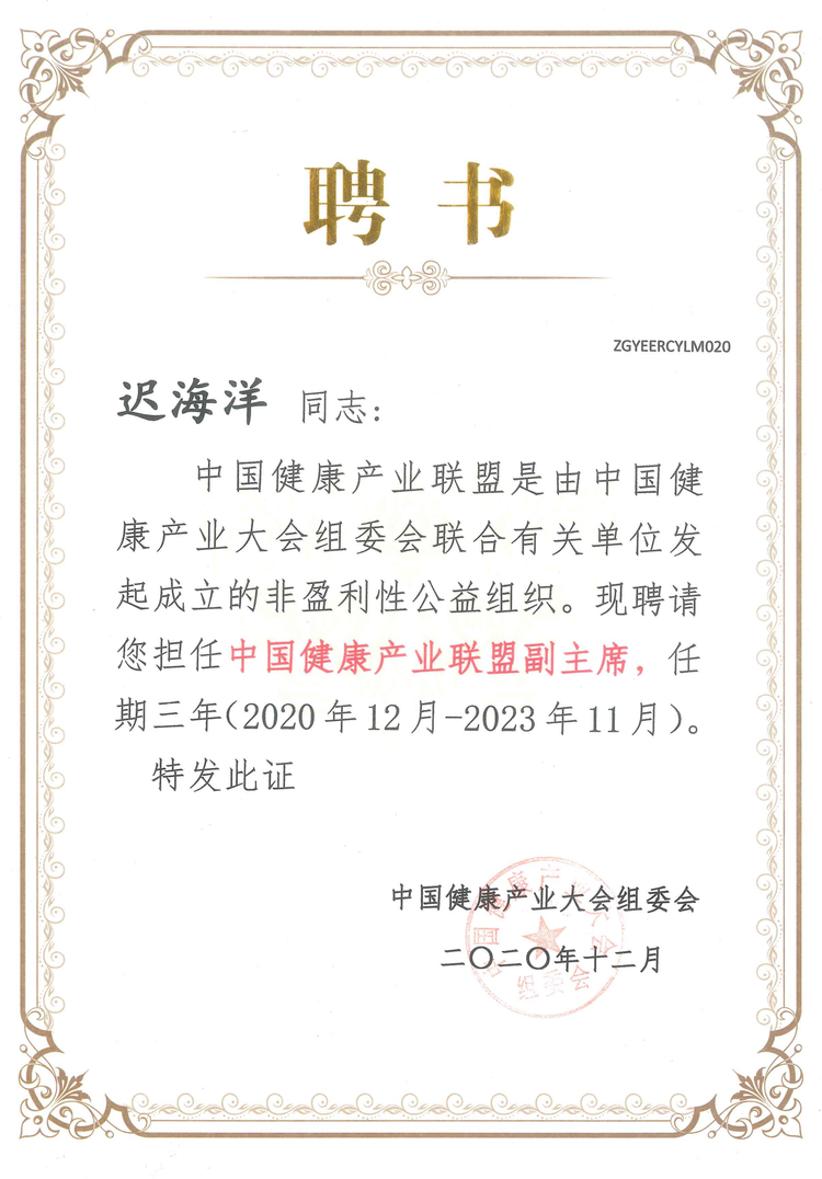 海涛集团CEO迟海洋女士受聘担任中国健康产业联盟副主席