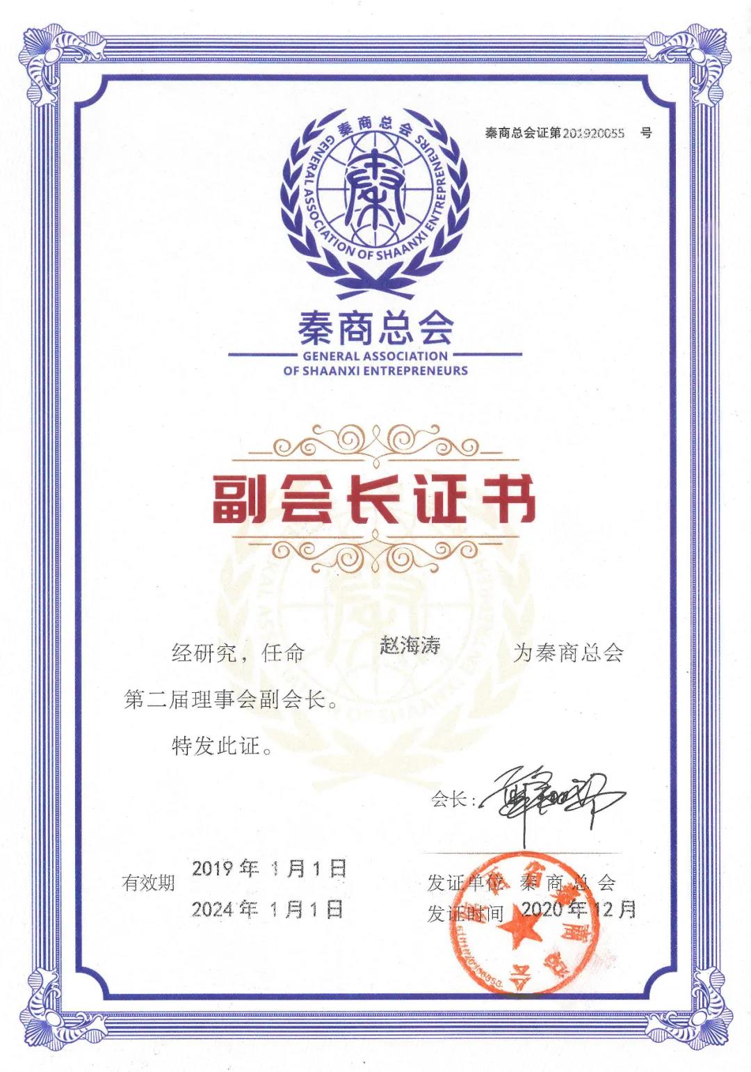 秦商总会第二届理事会副会长任命证书