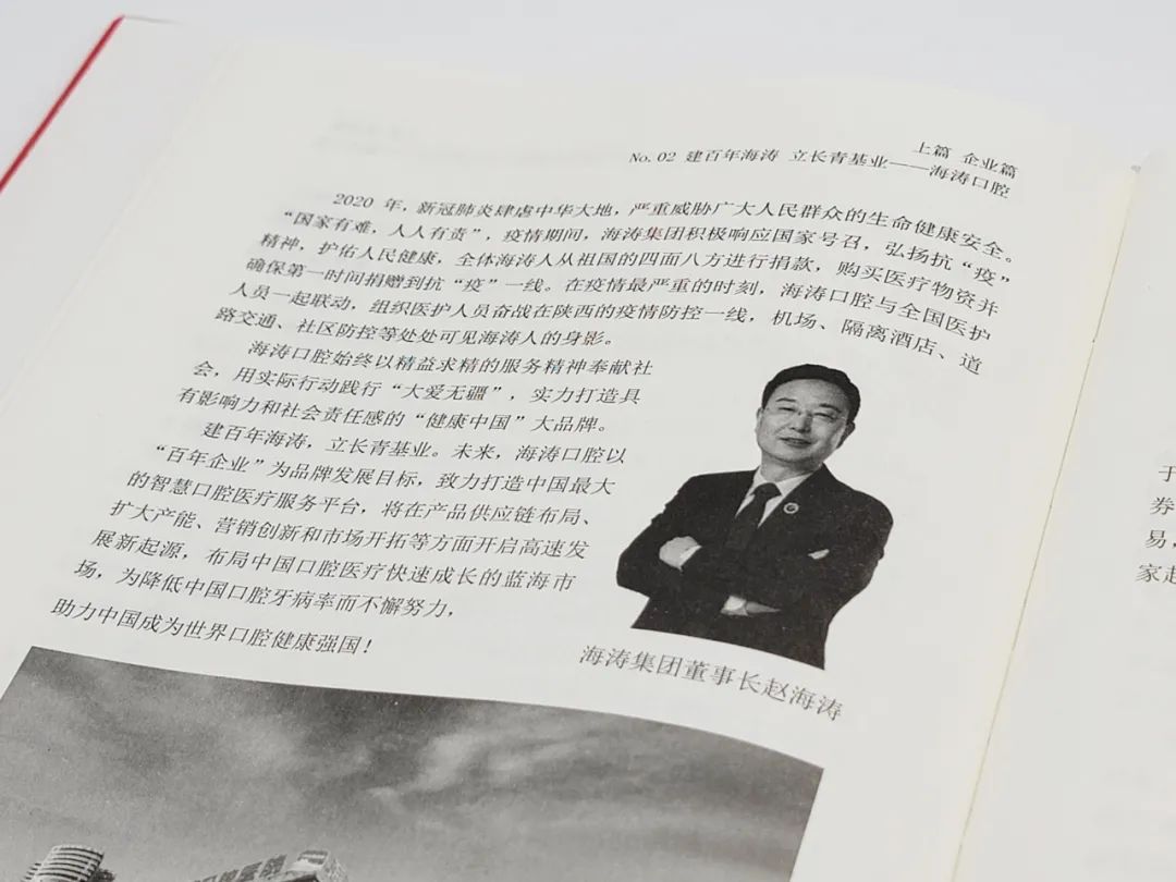 本书“企业篇”第二篇文章,就对“海涛口腔”从创业创新到发展壮大为大国品牌的历程,以及海涛集团董事长赵海涛先生“大医精诚”的医者情怀进行了详细的介绍。