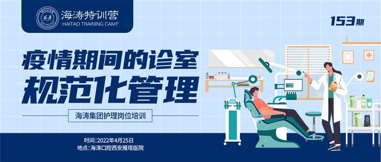 为进一步做好海涛口腔疫情防控及院感防控工作,2022年4月25日,“海涛特训营”第153期在海涛医疗科技集团(以下简称“海涛集团”)在西安雁塔医院举办了以“疫情期间的诊室规范化管理”为主题的护理岗位培训,海涛口腔各大区医院、门诊的护理岗位相关人员参加了培训,省外各大区通过线上直播的形式同步学习。