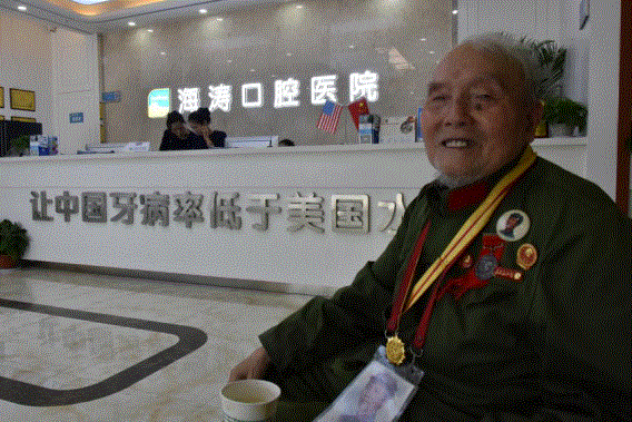 (精神矍铄的老革命徐树贵在正在海涛口腔医院一楼享用咖啡,讲述他与海涛口腔的不解之缘)