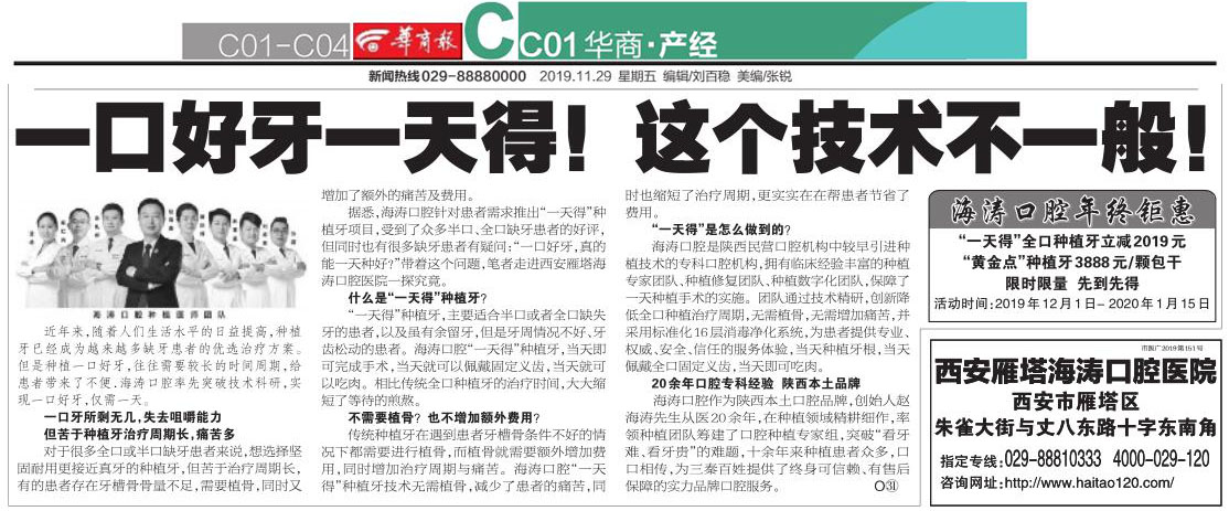 但苦于种植牙治疗周期长,痛苦多对于很多全口或半口缺牙患者来说,想选择坚固耐用更接近真牙的种植牙,但苦于治疗周期长,有的患者存在牙槽骨骨量不足,需要植骨,同时又增加了额外的痛苦及费用。据悉,海涛口腔针对患者需求推出“一天得”种植牙项目,受到了众多半口、全口缺牙患者的好评,但同时也有很多缺牙患者有疑问: “一口好牙,真的能一天种好?”带着这个问题,笔者走进西安雁塔海涛口腔医院一探究竟。