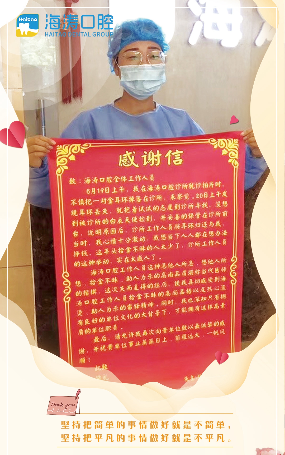 每个月,海涛口腔都会收到数十面锦旗和感谢信,既有对员工好人好事的感恩,也有对医师精湛医术和护士无微不至服务的褒扬,而更多是的顾客对海涛口腔企业文化的极大肯定。
