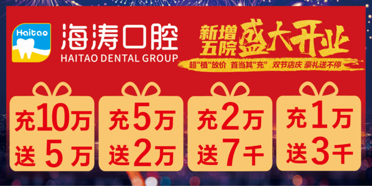 为了感恩回馈广大新老顾客朋友,金秋十月,海涛口腔在五院盛启之际,特别推出“新院开业盛典·双节充值送礼”系列活动。
