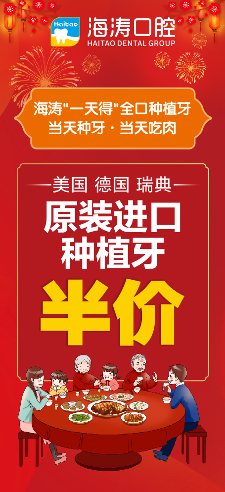 海涛“一天得”全口种植牙技术自推出以后,以其独特的优势受到众多多颗、半口以及全口缺失牙人群的青睐。为了让更多的缺牙患者能够享受到种植牙带来的便利,在年底与家人欢聚一堂,共享团圆之喜。海涛口腔特推出以下福利: