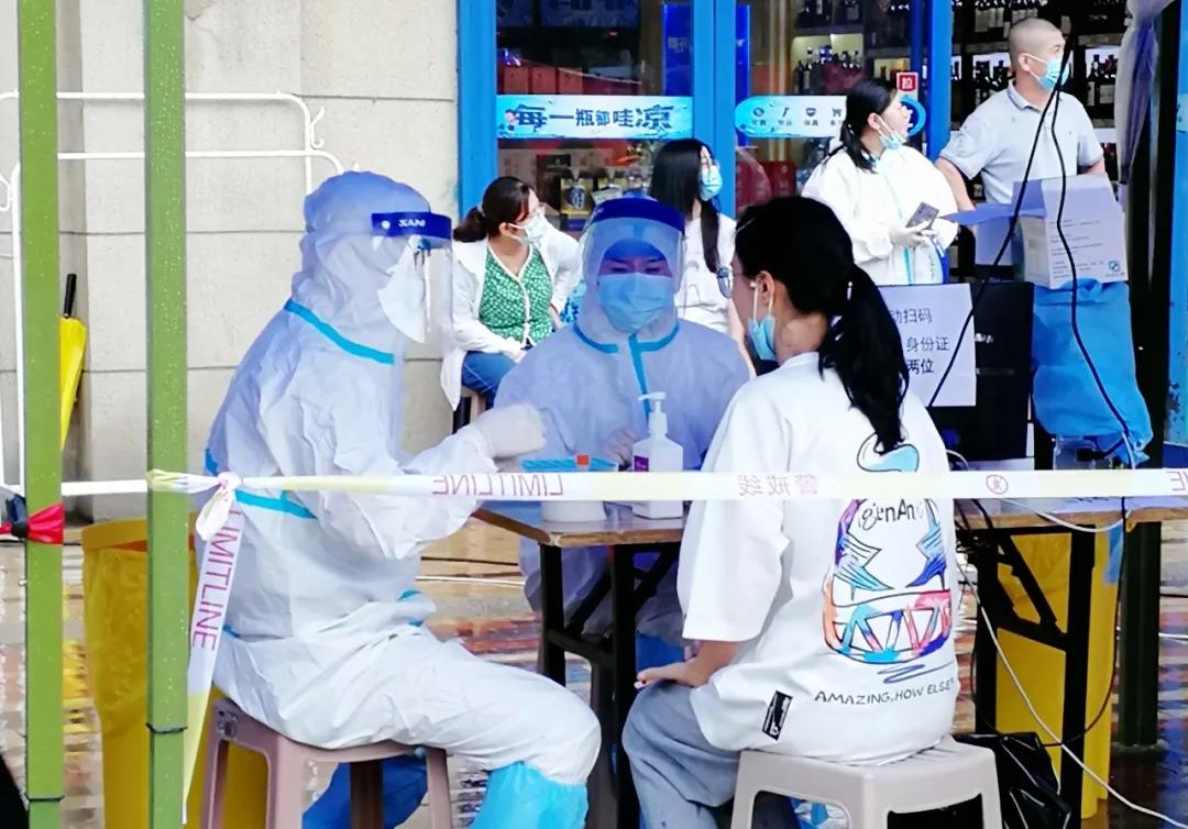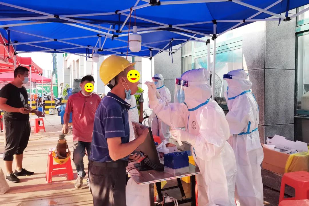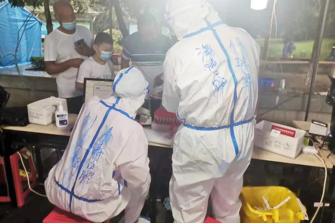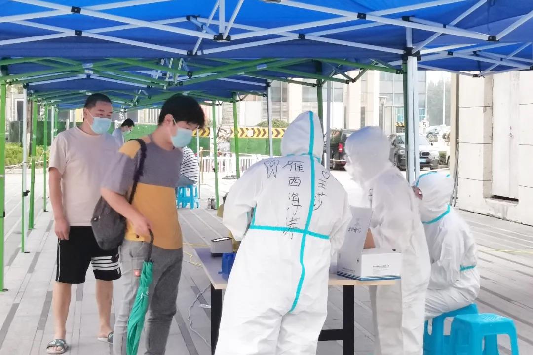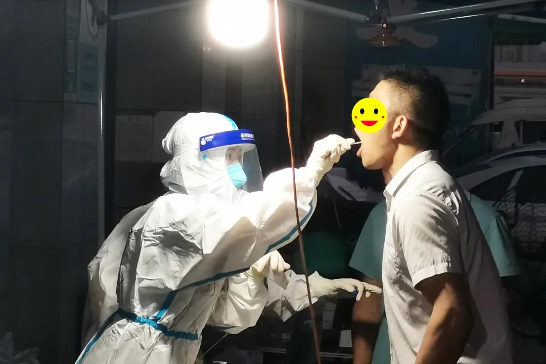 海涛口腔西安雁塔雁西门诊的检测人员在漳浒寨街道欣桥市场,分白天、晚上两个班次开展核算检测。天热的时候汗流浃背,晚上忙到12点,有时一忙起来连饭都忘记了吃。